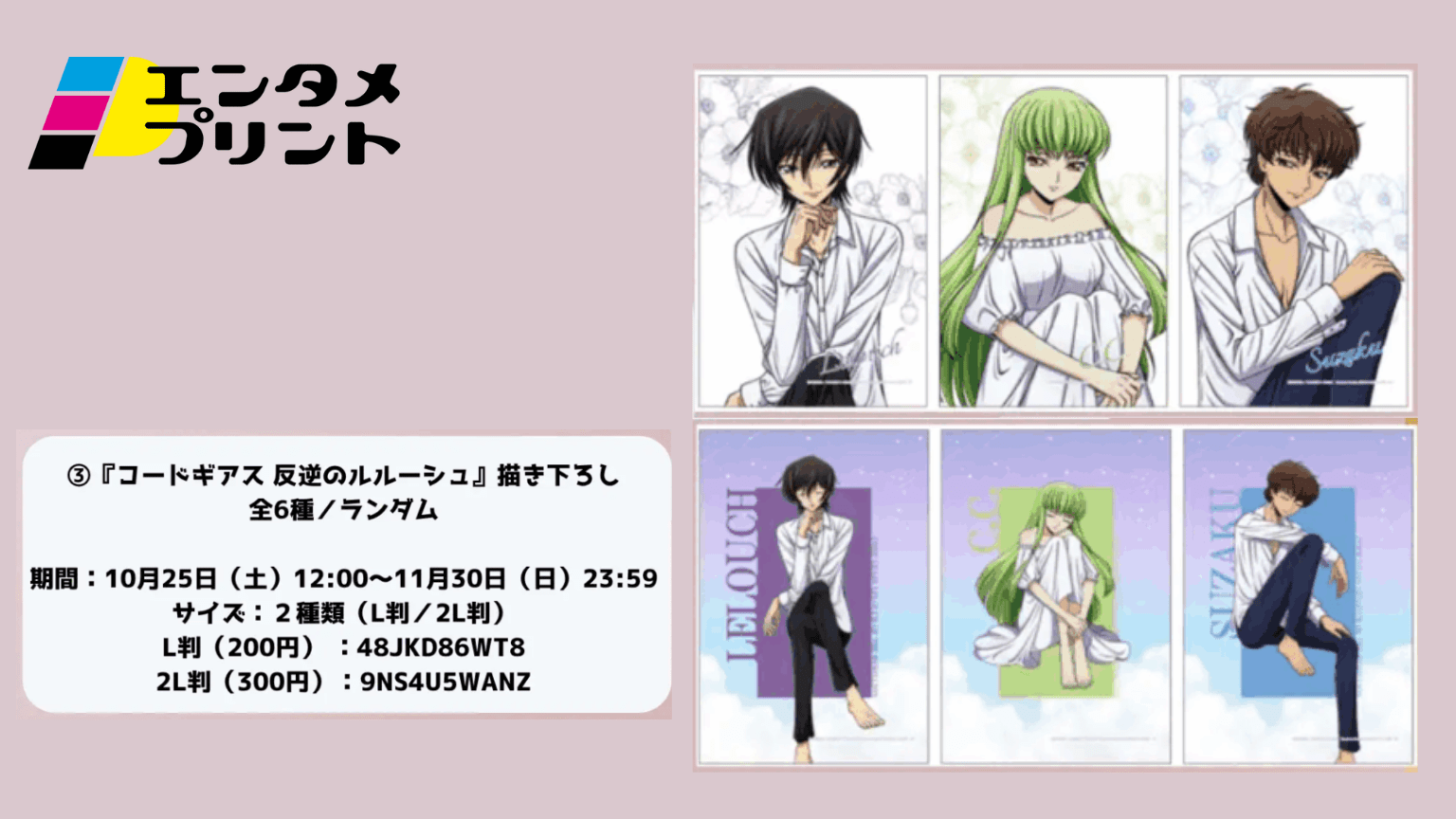 今回は、アクセサリーの企画・制作・販売から、イベント・展示会の企画・制作までを手掛ける株式会社エテルノレシによる、アニメ『コードギアス 奪還のロゼ』および『コードギアス 反逆のルルーシュ』のPOP UP STORE(11月4日終了)とグッズ展開に連動し、エンタメプリントにてブロマイドを11月30日まで販売中です。