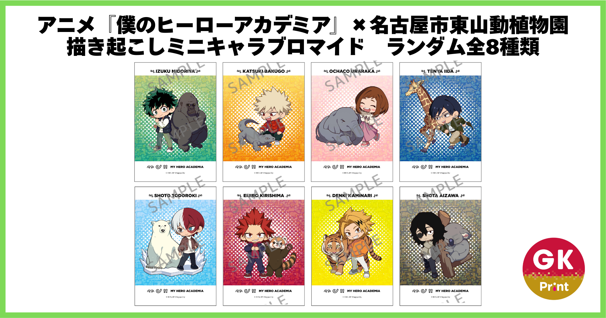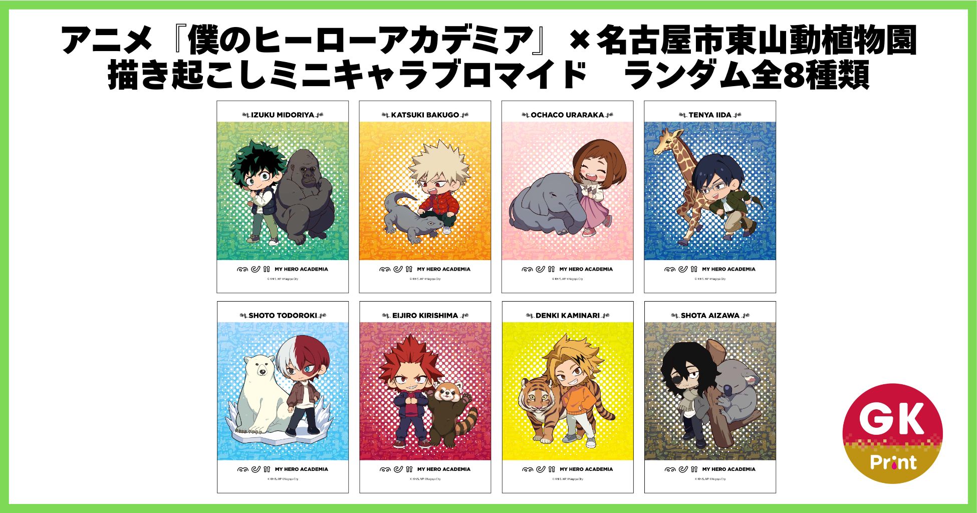 『僕のヒーローアカデミア』と、名古屋市東山動植物園との初のコラボキャンペーン「PLUS ULTRA ANIMALS!“個性”を磨け!動物の世界で“更に向こうへ”」の開催に合わせて、「GKプリント」として描きおこしミニキャラブロマイドを販売します。